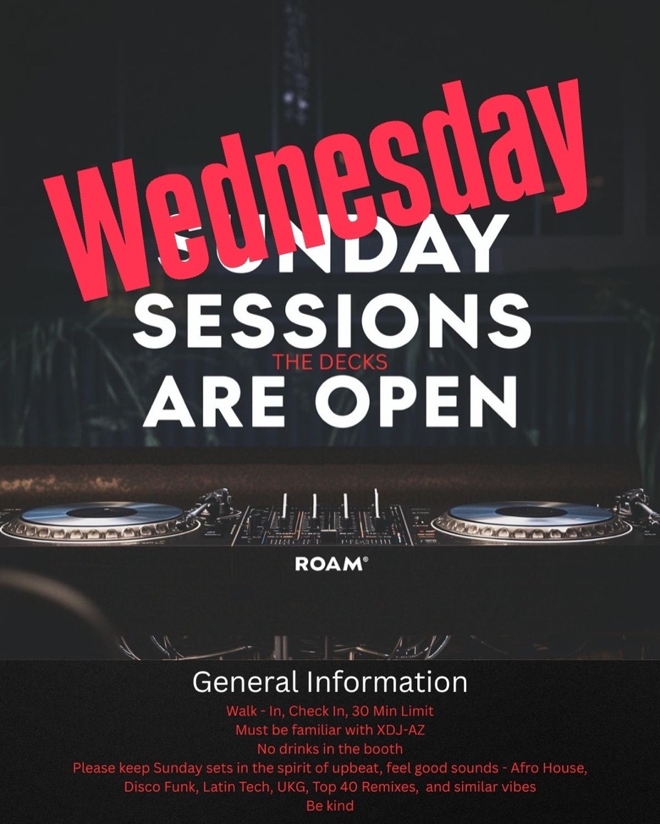 Walk in, check in, 30 minute limit. Must be familiar with an XDJ-AZ. No drinks in the booth. USB access only (no laptop). Please keep sets in the spirit of upbeat, feel good sounds - Afro House, Disco Funk, Latin Tech, UKG, Top 40 Remixes, and familiar vibes. Be kind.